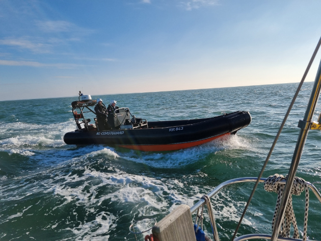Het was reeds de vierde etappe die we maakten, tijdens deze transfer. Op zaterdagmorgen waren we vertrokken vanuit Ijmuiden, waar we 14 dagen voordien ons zeiljacht hadden achter gelaten en na een rustige dagtocht hadden we Scheveningen aangelopen om te overnachten. De volgende dag vertrokken we opnieuw richting Nieuwpoort. Het weer was rustig, zonnig maar fris zoals je zulke dagen hebt in de Januari. Op zeil haalden we een vlotte 6kn met een knik in de schoot. We passeerden de Maasmond en zoals het hoort, meldden we ons en via de voorgschreven passage, kruisten we de drukke aanloop naar Rotterdam. Ter hoogte van Schouwen-Duiveland zagen, in de verte, een boot van de Nederlandse kustwacht in tegengestelde richting. Het viel ons op omdat we ook ter hoogte van de waddeneilanden reeds een boot van de Nederlandse kustwacht hadden gepasseerd met zijn typische beschildering. Daarchter waren nog een aantal cargo’s, roro’s en een enkele tanker te zien. Inne was benedendeks in het kombuis bezig en ik was, met mijn oortjes in, de wacht aan het houden aan het stuurwiel toen plots, een kwartierje later, een RIB langszij kwam gevaren. Ze hadden ons opgelopen aan bakboord zonder dat we er erg in hadden.