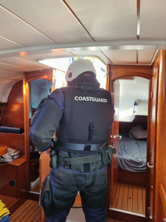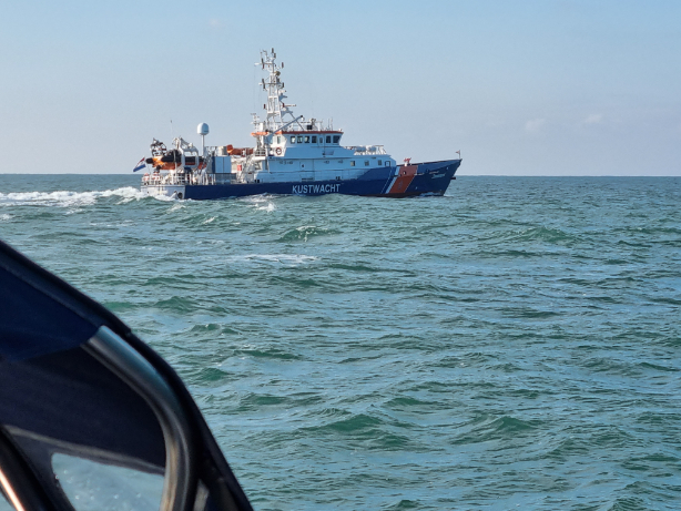 Het was de Nederlandse kustwacht !! Ze vroegen of ze aan boord mochten komen. Dit werd toegestaan. Twee personen blijven in de RIB en twee personen kwamen aan boord. Eén iemand van de kustwacht en één douanier, die alle document naging vooral met betrekking tot aankoop en eigendom. Vervolgens ging hij benedendeks en trok alle laden open, inspecteerde alle kasten en nam kussens weg op zoek naar mogelijke smokkelwaar. We maakten nog een praatje en nadien vertrokken ze, even snel als ze gekomen waren terug naar het grote schip die zich ondertussen had gekeerd en opnieuw onze richting was uit gekomen.